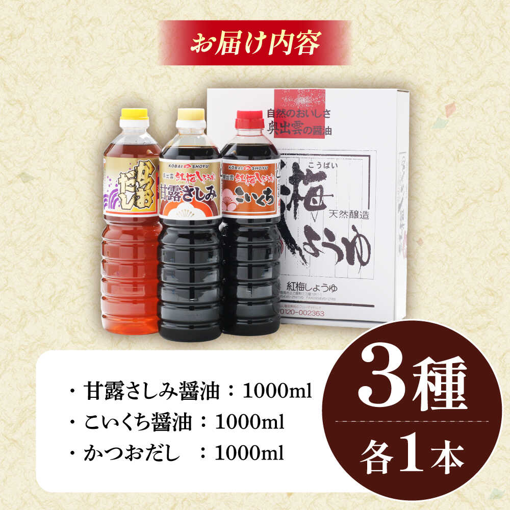 【ふるさと納税】食の愉しみ調味料3本セット【甘露さしみ醤油、こいくち醤油、かつおだし】各1000ml 調味料 だし かつおだし 醤油 しょうゆ こいくち ギフト 詰め合わせ 島根県雲南市/有限会社紅梅しょうゆ[AICV041]