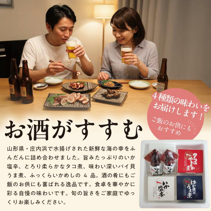 - 【ふるさと納税】海の幸詰め合わせセット 庄内浜の香箱「酒のとも」 いか塩辛 タコのやわらか煮 バイ貝のうま煮 いかめし 冷凍便 ※離島発送・着日指定不可 シーフード お手軽 おつまみ おかず 詰め合わせ イカ タコ 山形県 酒田市 庄内