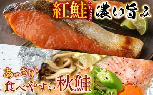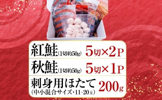 A-14093 紅鮭10切・秋鮭切身5切、天然ほたて貝柱200g