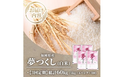 ≪令和7年産新米≫【3回定期便・白米】【食味鑑定士厳選】福岡県産 夢つくし(総計60kg・5kg×4袋×3回) 白米 米 お米 おこめ ごはん ゆめつくし ご飯 常温 福岡県産 ブランド米 定期便 定期 頒布会 常温 常温保存 【ファインリョーコク】as34-015