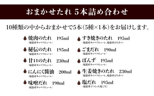 - 【 年内配送 12/8入金確認分まで】 【訳あり】 肉料理のタレ おまかせ 5本 詰め合わせ 調味料 国産 加工品 万能調味料 人気 焼き肉 タレ おすすめ 特製たれ 食べ比べ バーベキュー キャンプ おすそ分け [AH059tu]