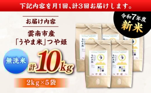 無洗米【全3回定期便】「うやま米」つや姫 10kg(2kg×5)米 無洗米 お米 コメ おこめ つやひめ 定期便 むせんまい おすすめ 人気 米 ごはん ご飯 食卓 主食 ブランド米 お取り寄せ グルメ ご当地米 家族 ファミリー 一人暮らし 便利 毎月 おいしい ごはんソムリエ ミネラル 国産 新生活 お弁当 朝ごはん 朝食 昼食 ご当地 島根県雲南市/有限会社藤本米穀店 [AIDB097]