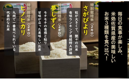 - 【2月配送】令和7年度産 佐賀県認定 特別栽培米 小城のお米(さがびより・ヒノヒカリ・夢しずく) 3種類×2kg 田中農場