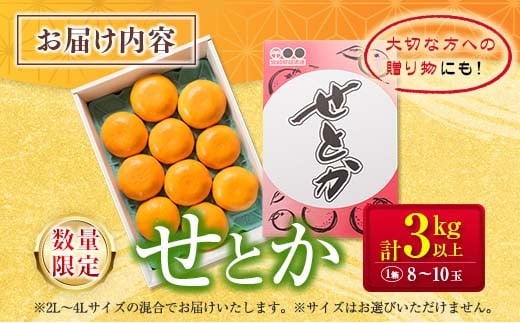 - 柑橘界の大トロ!! とろけるような食感!! せとか 計3kg以上 化粧箱入り 期間限定 数量限定 先行予約 2026 令和8年発送 果物 くだもの 柑橘 みかん おやつ デザート 国産 食品 おすすめ ギフト 贈り物 贈答 おすそ分け お祝い お返し 宮崎県 日南市 送料無料_D99-24