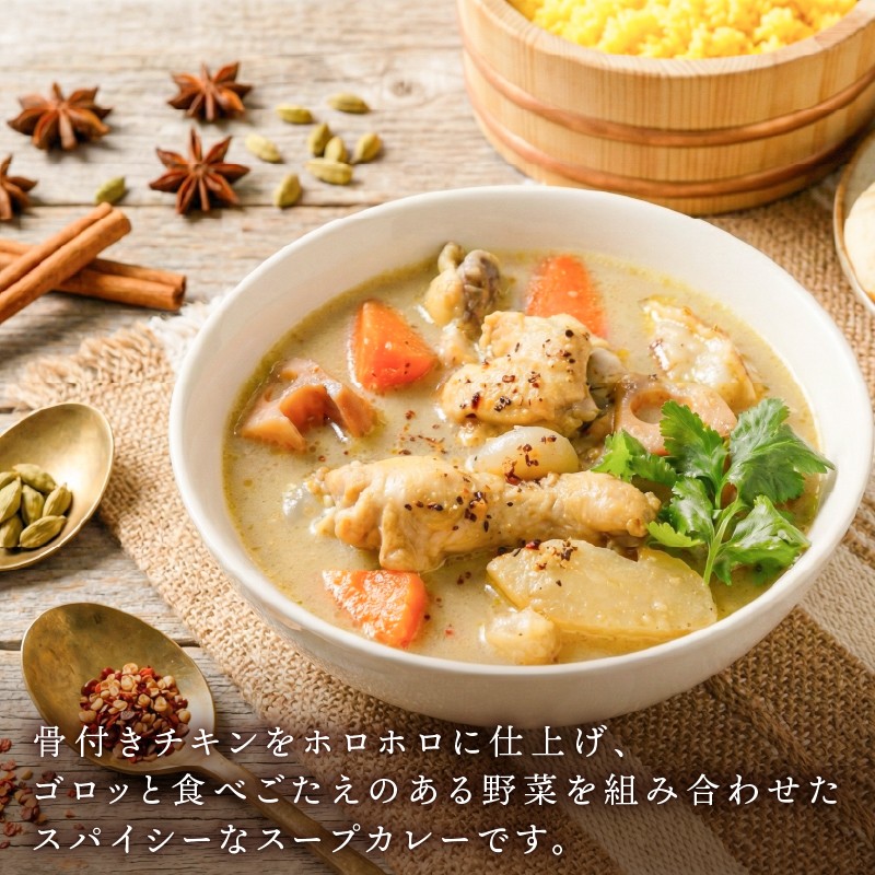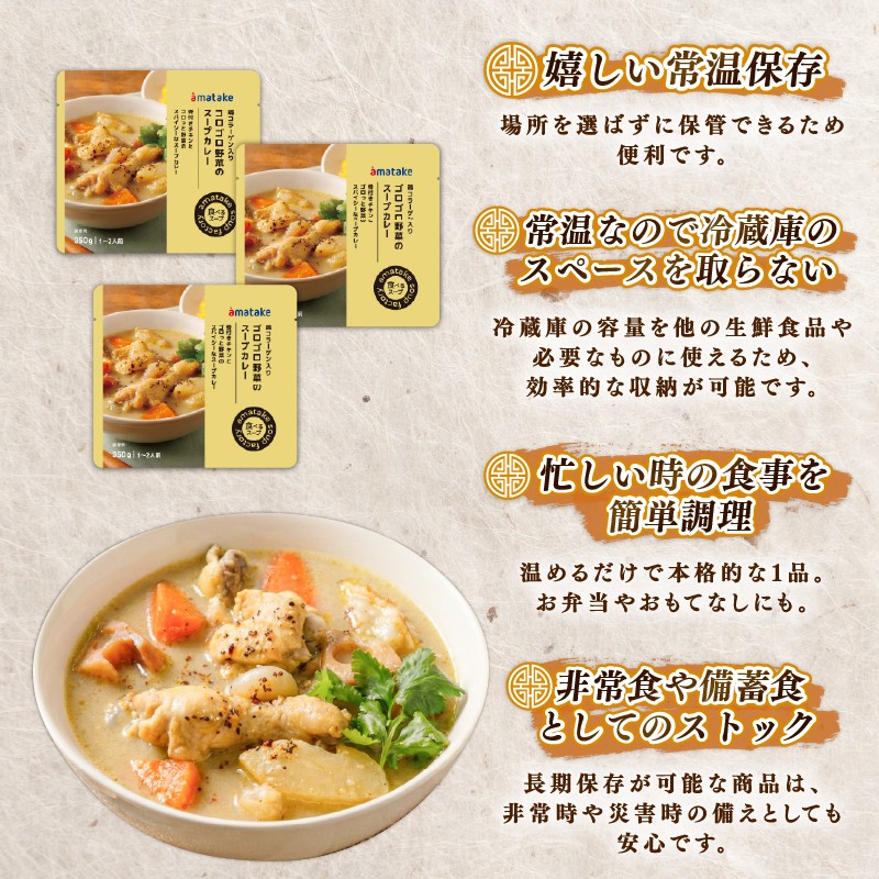 - ゴロゴロ野菜のスープカレー 3袋 常温保存 レンジ 温めるだけ カレー 手羽 鶏肉 チキン 常温 備蓄 非常食 災害 被災 おかず すーぷ 小分け タンパク質 朝食 アマタケ 岩手県 大船渡市