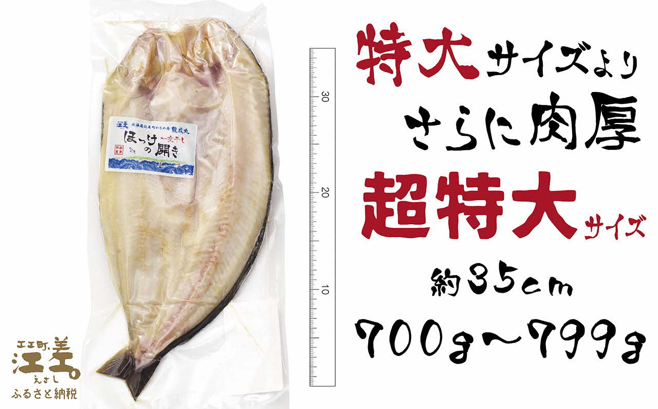 - 《数量限定》【超特大700gアップ】北海道かもめ島特産 とった漁師が自らつくる こだわりの ほっけの開き 〈超特大〉サイズ 1枚 約35cm 700g以上800g未満 大サイズより肉付きがよい 甘塩 漁師直送 北海道日本海のホッケ 一夜干し 魚の干物 国産