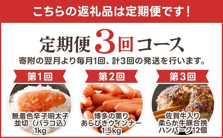 【定期便(3回発送)】古賀市三大人気グルメ定期便 無着色 辛子明太子 ウインナー 博多の薫り 粗挽き ソーセージ 佐賀牛 合挽 ハンバーグ 牛 柔らかい ジューシー おかず 惣菜 弁当 小分け 福岡県 福岡 九州 グルメ お取り寄せ