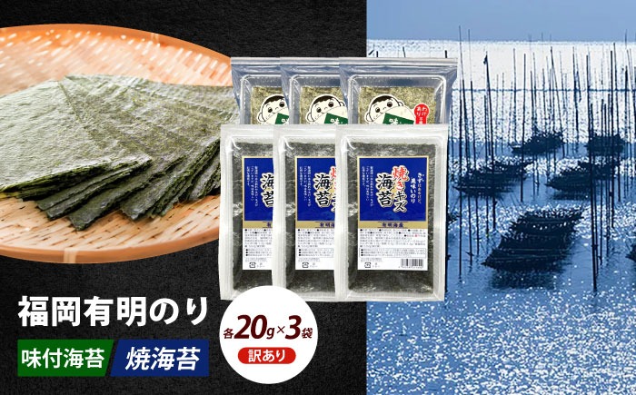 - 【訳あり】福岡有明のり 焼海苔と味付海苔袋 20g×各3袋セット 《築上町》 【株式会社木村食品(千代海苔株式会社)】海苔 のり ノリ おかず ごはん[ABEI020]