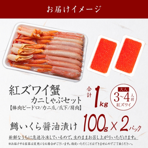 3612. 紅ズワイ 蟹しゃぶ ビードロ 1kg 生食 鱒いくら油漬け 200g 紅ずわい 蟹 カニ 鱒 いくら イクラ しゃぶしゃぶ 鍋 海鮮 カット済 送料無料 北海道 弟子屈町