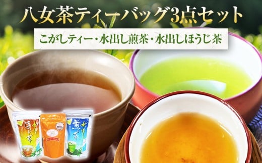 - 八女茶ティーバッグ 3点セット こがしティー 水出し煎茶 水出しほうじ茶 計3袋 焦がし商品 くき茶 ティーバッグ 3種 詰め合わせ ほうじ茶 煎茶 八女茶 九州 送料無料
