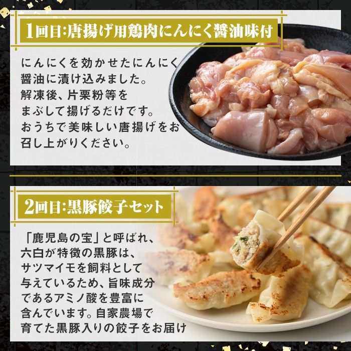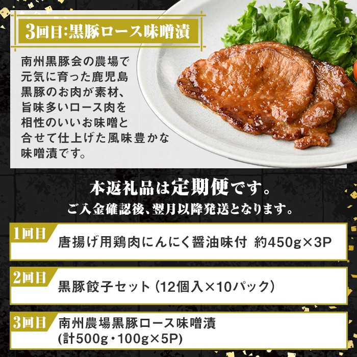 - D90001 <定期便・全3回>肝付町セレクト定期便《簡単調理で肉を楽しむ定期便》 簡単調理 鶏肉 黒豚 豚肉 餃子 味噌 味噌漬け 【株式会社きもつき未来商社そらまち】