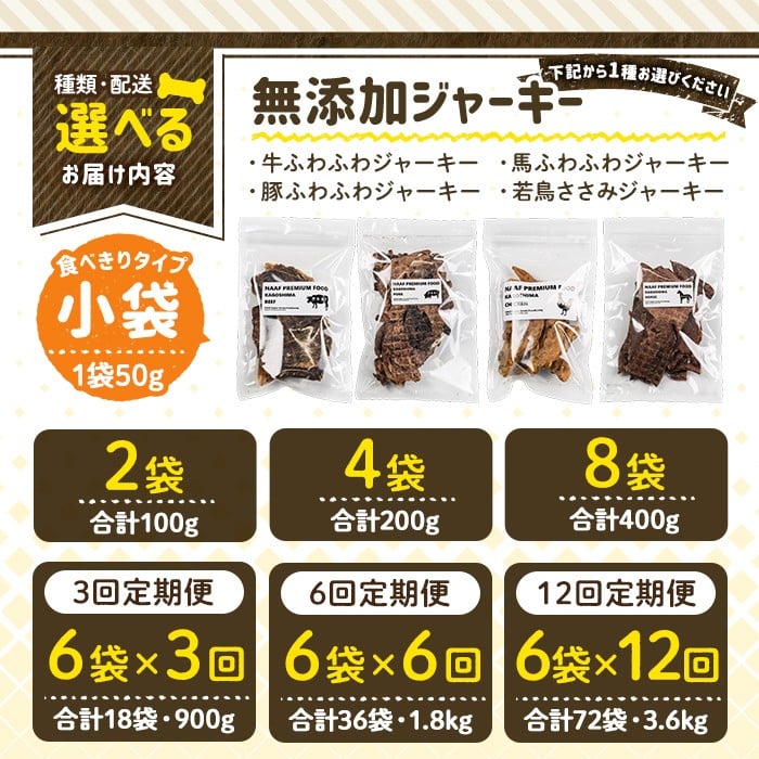 - 《種類・配送が選べる》<保存料・着色料 不使用>愛犬用無添加ジャーキー(小袋50g or 大袋300g・3回定期便・6回定期便・12回定期便)【Nフードサービス】姶良市 牛 豚 鶏 馬 魚 ジャーキー 犬 ドッグ ペット フード エサ おやつ ごはん 間食 ご褒美 ペット関係 a882 a883 a1051 a1052 a1053 a1054
