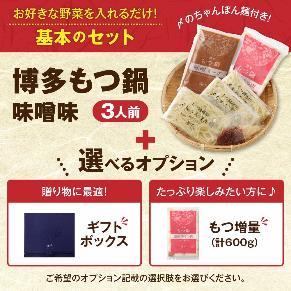 - 【ふるさと納税】<選べる>博多もつ鍋 味噌味(3人前)ギフトボックス もつ増量【海千】 送料無料国産牛もつ 国産味噌 国産牛もつ 明太子 もつ鍋 セット ちゃんぽん麺 美味しい 3人前