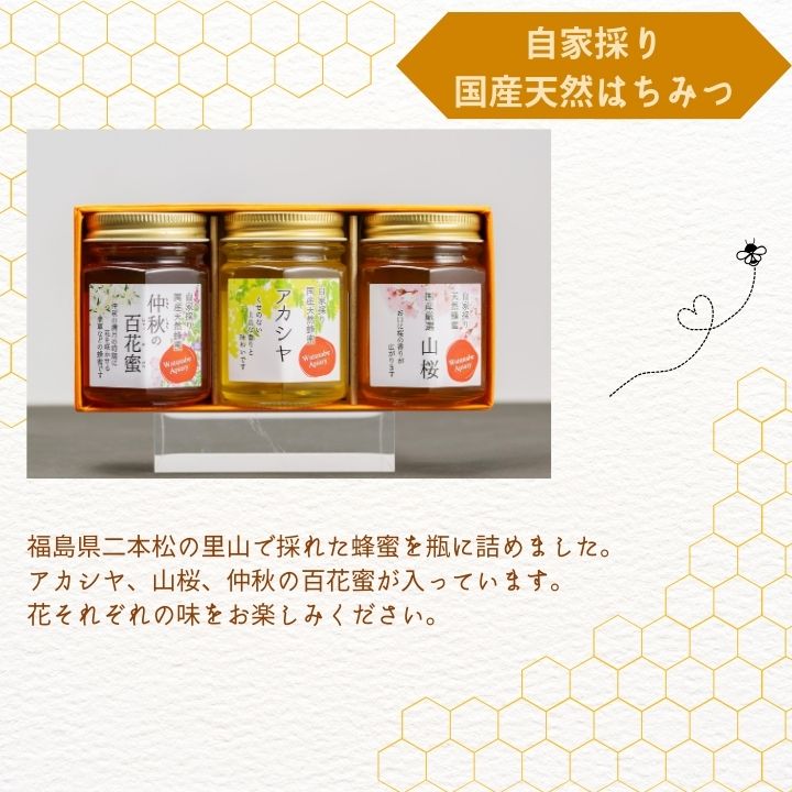 - 【ふるさと納税】 自家採り国産天然はちみつ 3本セット(140g×3) 蜂蜜 はちみつ ハチミツ 国産 百花蜜 アカシヤ アカシア ハニー 天然 無添加 おすすめ お中元 お歳暮 ギフト 二本松市 ふくしま 福島県 送料無料 【株式会社渡辺養蜂場】