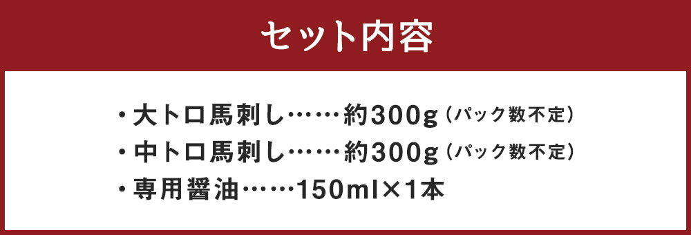 - 【ふるさと納税】【桜屋】大トロ 中トロ 馬刺し 2種 食べ比べセット 計600g(各300g) 専用醤油付き:150ml×1本 馬肉 お肉 馬刺 霜降り サシ 赤身肉 希少部位 詰め合わせ しょうゆ 冷凍 熊本県 水上村 送料無料