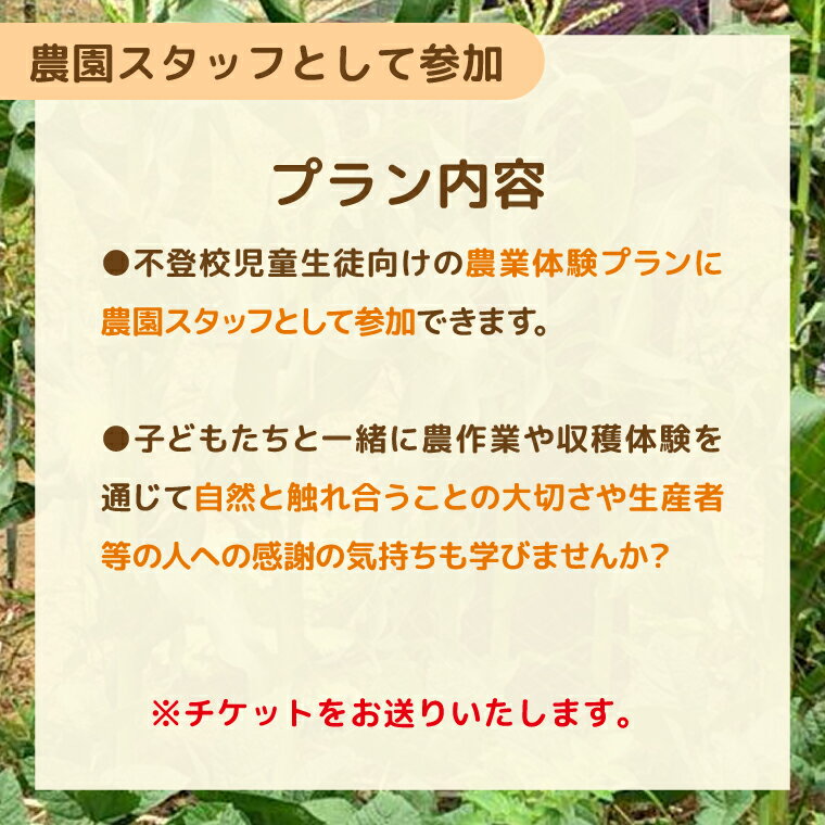 - 【ふるさと納税】 体験 チケット 支援 農園スタッフ 見守り 不登校児 不登校生徒 居場所 学び 手伝い 野菜収穫 旬の野菜 収穫体験 食育 収穫体験 農業体験 体験 収穫 野菜 子供 親子 農作物
