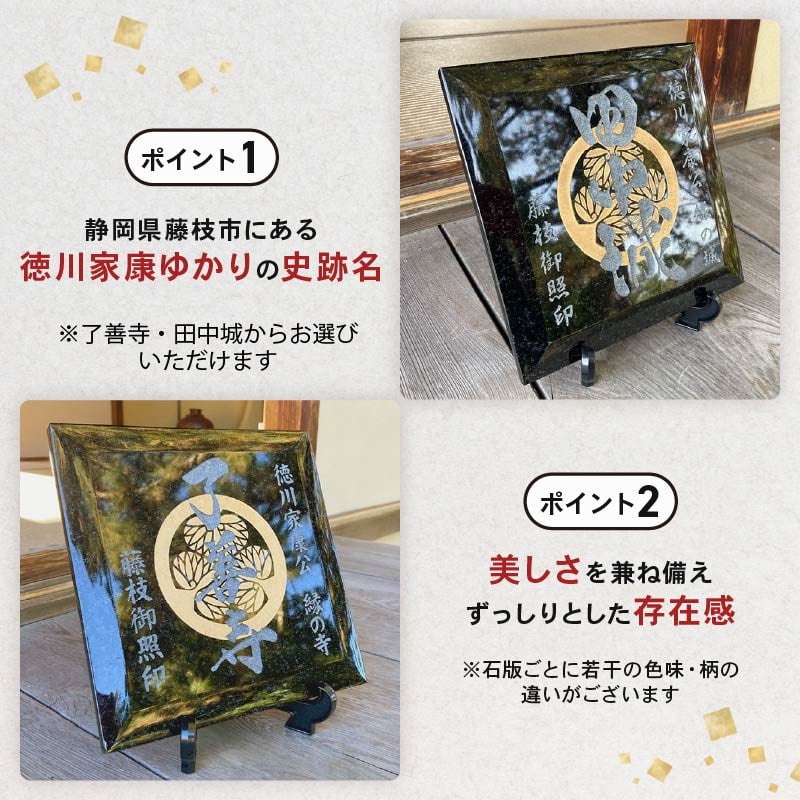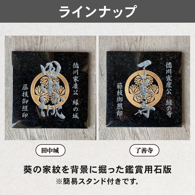 - 【選べる】 藤枝 御照印 徳川家康 ゆかりの 石版 1個 簡易 スタンド 付き 了善寺 田中城 葵 家紋 観賞用 歴史 徳川 家康 三つ葉葵紋 戦国 ロマン 静岡県 藤枝市