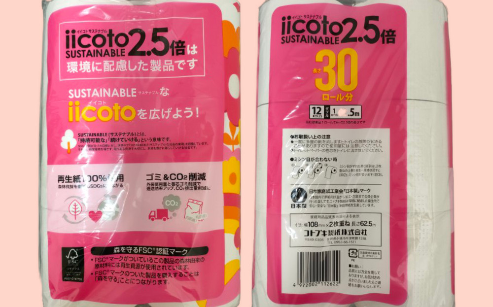 トイレットペーパー iicoto2.5 ダブル 72ロール 4500m(12ロール×6パック×62.5m)