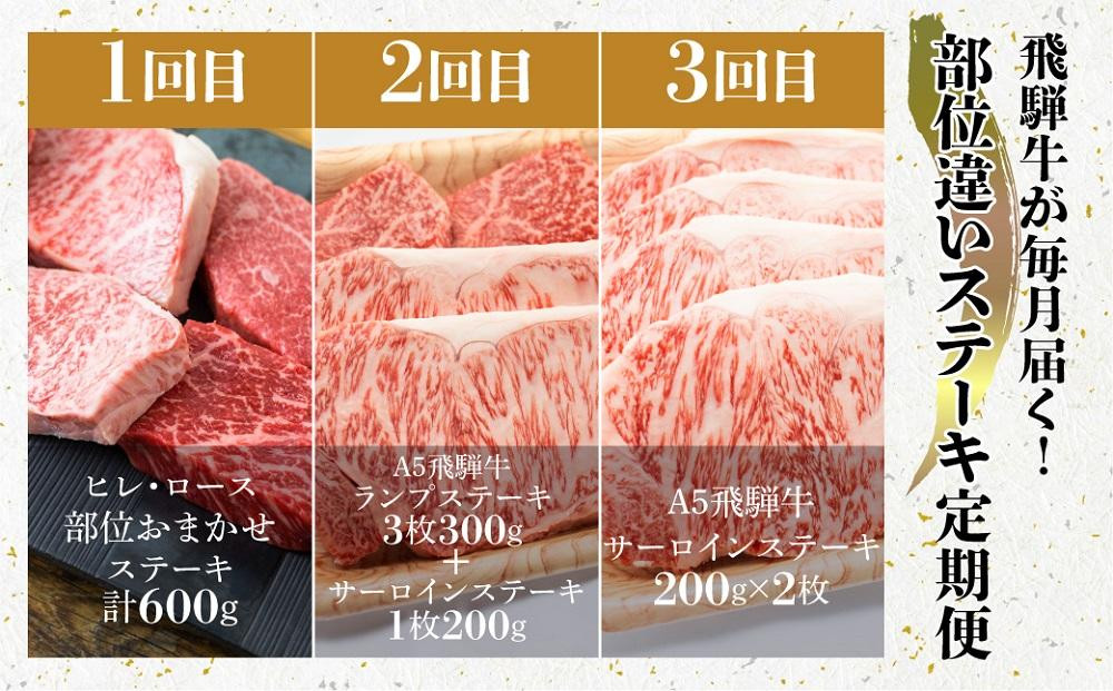 - 【定期便 3ヶ月】<全3回> A5飛騨牛 ステーキ(ヒレ/ロース/ランプ/サーロイン)| 肉 牛肉 飛騨牛 和牛 牛肉 黒毛和牛 ブランド牛 ステーキ ヒレ サーロイン ロース ランプ 飛騨高山 飛騨牛 定期便 飛騨牛ステーキ 飛騨牛ヒレ 飛騨牛ロース 飛騨牛ランプ 飛騨牛サーロイン 牛肉 定期便 飛騨牛づくし 飛騨牛 定期便 牛肉 定期便 飛騨牛 定期便 肉の匠家 BV103