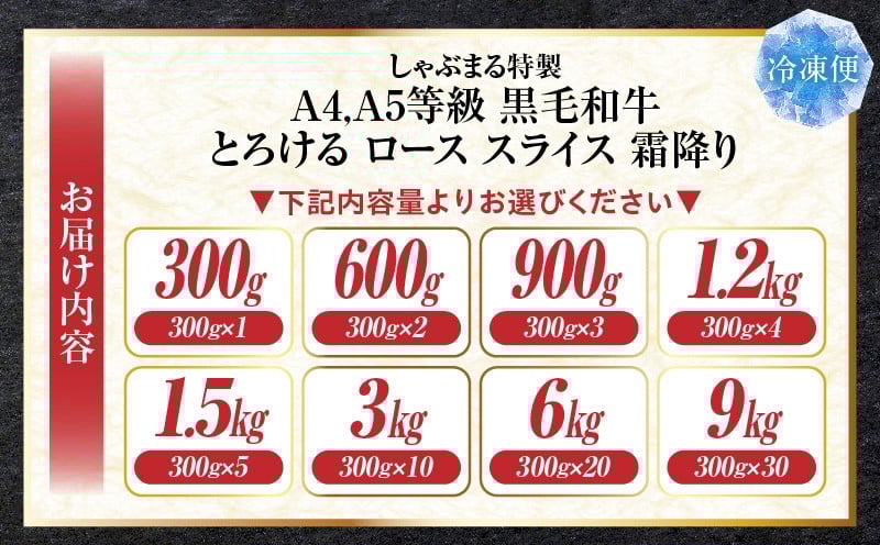 - 【選べる内容量】しゃぶまる特製 A4,A5等級 黒毛和牛 とろける ロース スライス 霜降り | 肉 牛肉 黒毛和牛 ロース 霜降り ジューシー スライス 鍋 しゃぶしゃぶ すき焼き とろける 濃厚 冷凍 香川県 三木町 おすすめ |_mk146-082