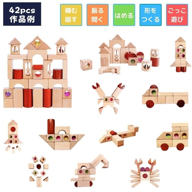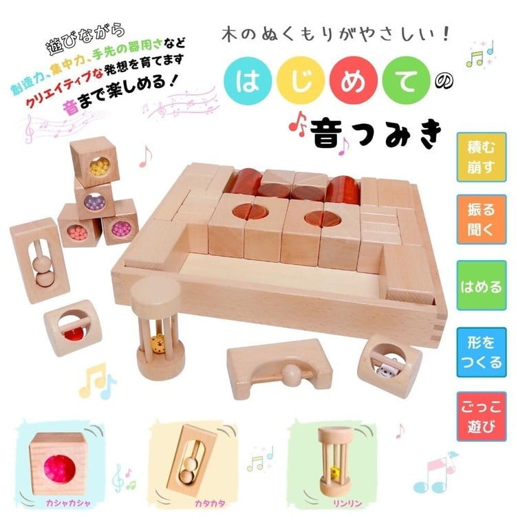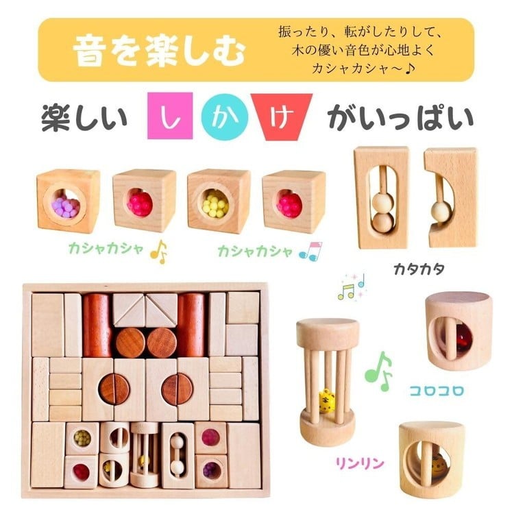 - tanoshimu はじめての積み木 42pcs | 知育玩具 音が鳴る 積み木 音楽 おもちゃ 木製 ブロック パズル クリスマス プレゼント 幼児 1歳半 2歳 3歳 誕生日 指先 知育 出産祝い 入園 祝い モンテッソーリ教育 ブナ材