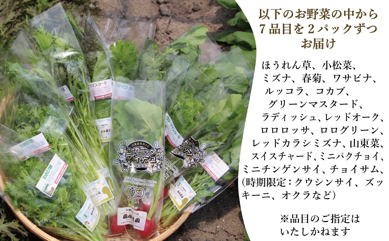 【定期便セット】オーガニック葉物野菜セット全3回【植物性肥料と植物性追肥を使って育てた葉野菜ブランド】葉野菜7品目×2パック