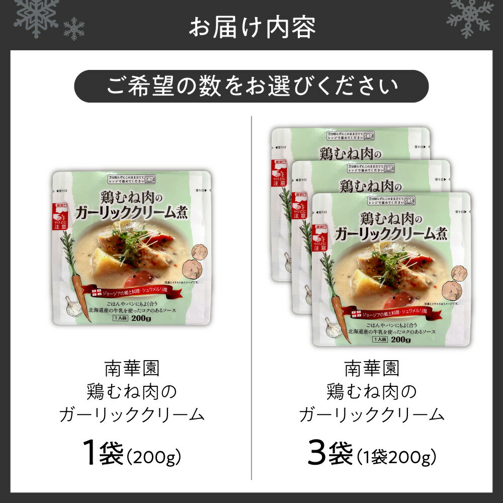 【ふるさと納税】 ガーリッククリーム煮 北海道産 鶏むね肉 【 選べる 数量 】 200g入り 1袋 3袋 南華園 レトルト ジョージア 郷土料理 シュクメルリ風 お取り寄せ グルメ 惣菜 時短 簡単調理 レンジ レンチン 常備食 湯煎 ガーリック クリーム煮 北海道 札幌市