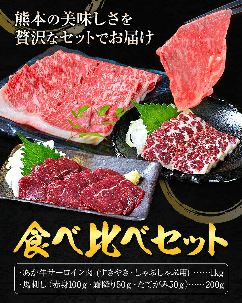 - 【ふるさと納税】あか牛 すきやき・しゃぶしゃぶ用 サーロイン肉1kg・馬刺し200g 食べ比べセット 選べる定期便 1回 3回 6回 12回 合同会社たべたせいか《出荷時期をお選びください》牛肉 和牛 馬刺し セット 熊本県産 送料無料
