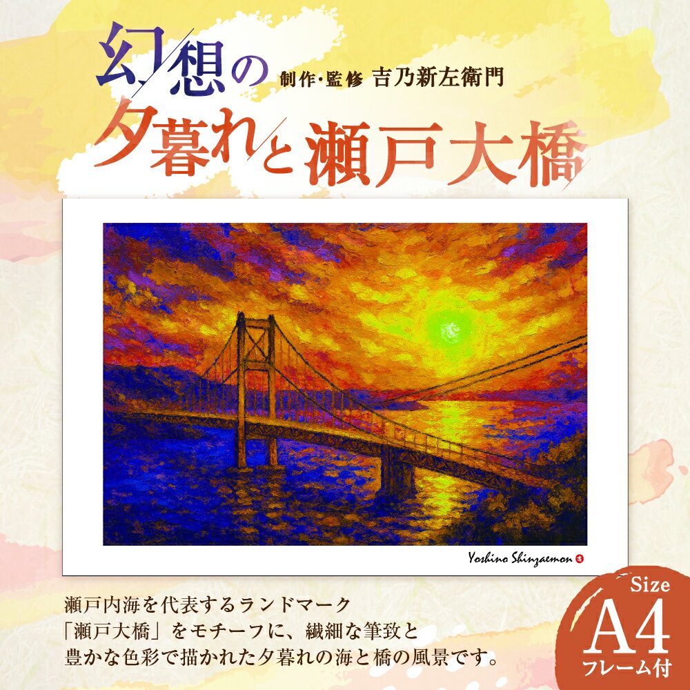 - 【ふるさと納税】幻想の夕暮れと瀬戸大橋 1枚 A4サイズ版 吉乃新左衛門 現代アート 倉敷の風景 瀬戸内海の景色 atelier SHINZAEMON 作画 原画コピー オリジナル額縁付 旅の思い出 ふるさとへの思い 部屋の雰囲気を最適化 絵画 インテリア 装飾 美術品 岡山県 倉敷市 送料無料