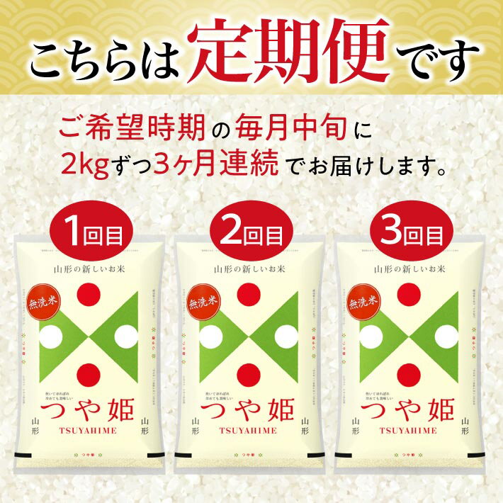 【ふるさと納税】≪3ヶ月定期便≫ 無洗米 つや姫 2kg×3ヶ月連続 計6kg 山形県庄内産 毎月中旬にお届け 東北 山形県 遊佐町 庄内地方 庄内平野 庄内米 精米 白米 米 お米 ブランド米 ごはん ご飯 連続定期便 3回連続 小分け
