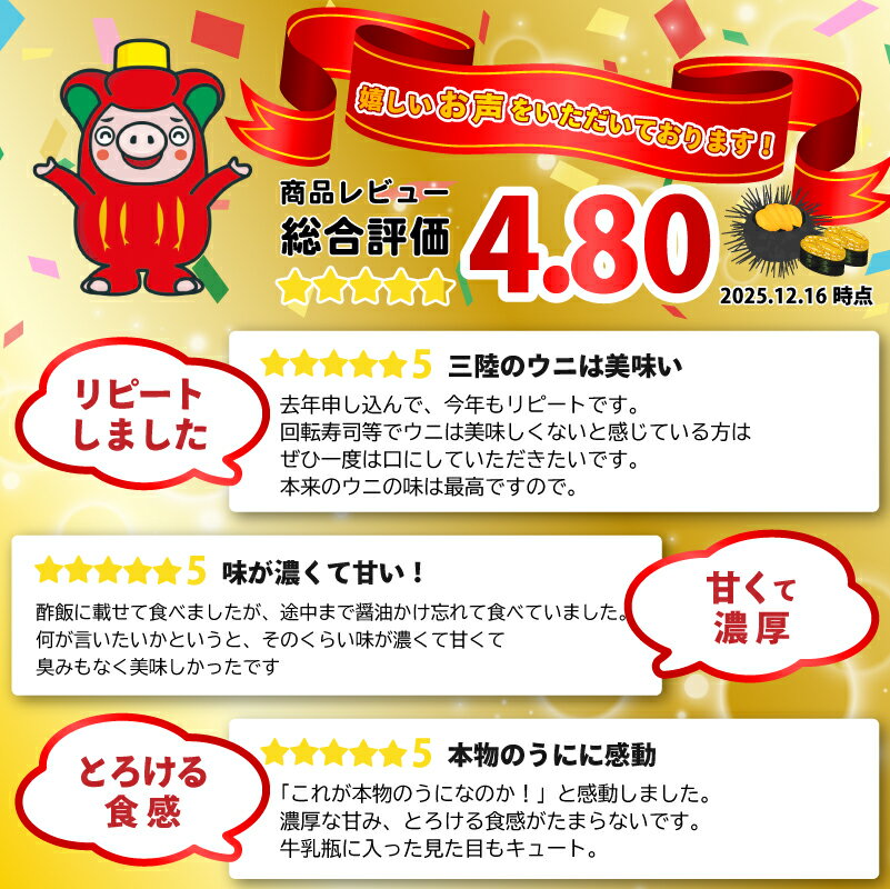 岩手県沿岸で採れるムラサキウニです。海藻類が豊富に育つ海で育っているため身が肥えており、濃厚な風味と甘みが特徴。色と形の良いうにを厳選し、ミョウバンを使わず、滅菌した海水と共に瓶に詰めています。「甘みがすごくあり美味しかった」「牛乳瓶にパンパンに詰まっていて、味もすごく美味しかった」などの声が寄せられています。