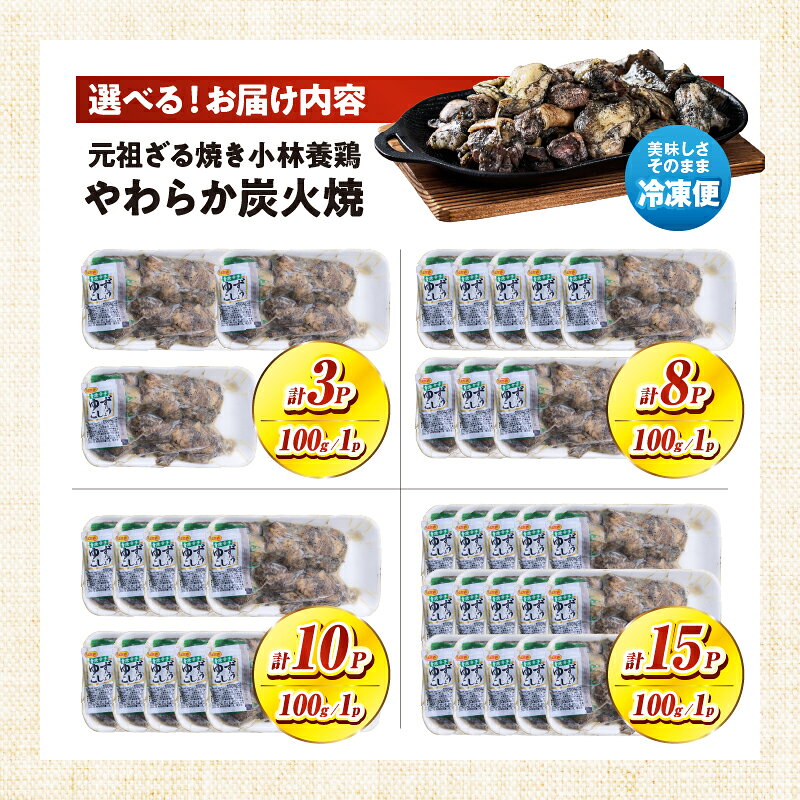- 【ふるさと納税】【選べる内容量】【テレビで紹介!元祖ざる焼き小林養鶏】やわらか炭火焼100g×3P~15Pセット 炭火焼 小分け 鶏 鶏肉 ゆず胡椒 総菜 調理済み 冷凍 おつまみ 人気 おすすめ 国産 ギフト プレゼント 贈り物 贈答 お祝い ご褒美 宮崎県 小林市 送料無料