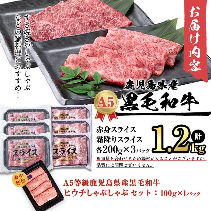 【小分け】<A5等級>鹿児島県産黒毛和牛 すき焼きしゃぶしゃぶセット(霜降りスライス・赤身スライス各200g×3P ヒウチしゃぶしゃぶセット) 牛肉 肉 小分け 鹿児島県産 国産 A5 すき焼き すきやき しゃぶしゃぶ 黒毛和牛 赤身 霜降り 食べ比べ 【志布志市制20周年記念】 b6-022-huc