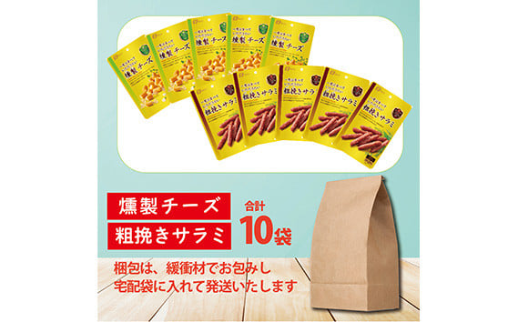 - おつまみ なとり 一度は食べていただきたい 燻製チーズ&粗挽きサラミ 10袋セット(2種×5袋) | サラミ チーズ オツマミ 粗挽き 燻製 食べ比べ 詰め合わせ セット 食品 おやつ 贅沢 酒の肴 個包装 小袋 家飲み 宅飲み 晩酌 お酒 ビール 特別 酒 贈り物 ナトリ 埼玉県 久喜市