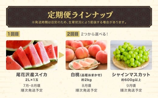 - 【先行予約】 選べる!フルーツ定期便 全2回 スイカ もも/シャインマスカットから選べる 秀品 2026年7月中旬~発送開始 2026年産 令和8年産 佐竹物産 ※沖縄・離島への配送不可 sb-fts2x