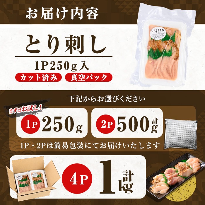 a926 《容量が選べる》とり刺し(計250g~最大1kg)【とり亭牧野】姶良市 国産 鳥刺し 鶏刺し 鶏肉 とり 刺身 小分け 真空パック 冷凍 おつまみ おかず