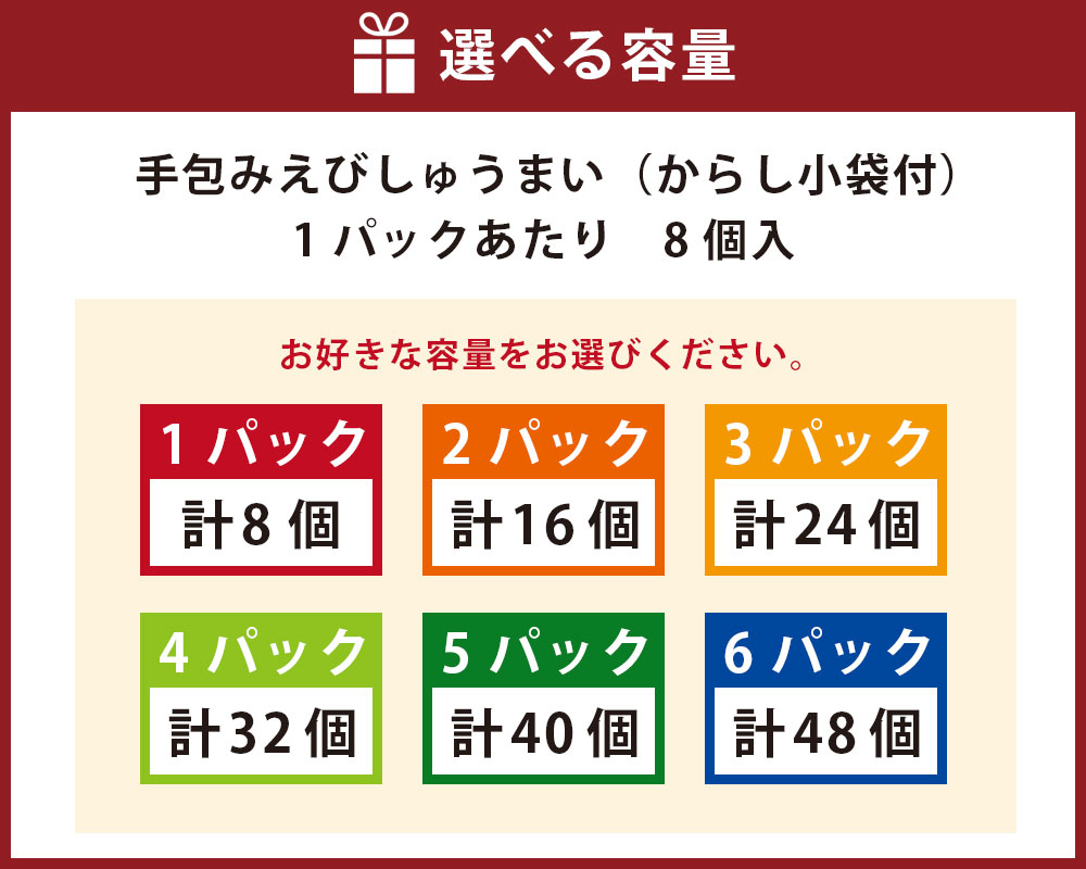 - 【ふるさと納税】<選べる容量> 【山八】 手包み えびしゅうまい (からし小袋付)計8~48個 1パック8個入 えび エビ 海老 しゅうまい 焼売 シュウマイ 点心 中華 料理 惣菜 おかず おつまみ グルメ 冷凍 国産 送料無料 [G4204r][G4205r][G4206r][G4207r][G4208r][G4209r]