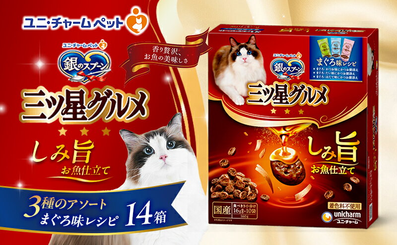 【ふるさと納税】銀のスプーン 三ツ星グルメ しみ旨 お魚仕立て まぐろ味レシピ 3種のアソート 160g×14箱 ペットフード キャットフード 猫のごはん 猫用フード 猫 ペット 小分け 個包装 ドライ ユニ・チャーム ペット お届け:通常ご寄附頂いてから約1~2ヶ月以内に発送