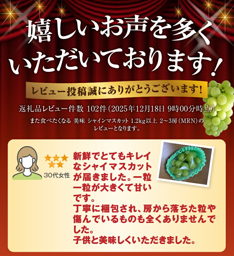 - また食べたくなる 美味 シャインマスカット 1.2kg 以上【2023年先行予約】果物フルーツ ぶどう 山梨県産 甲州市産 新鮮 人気 採れたて 厳選 (MRN)