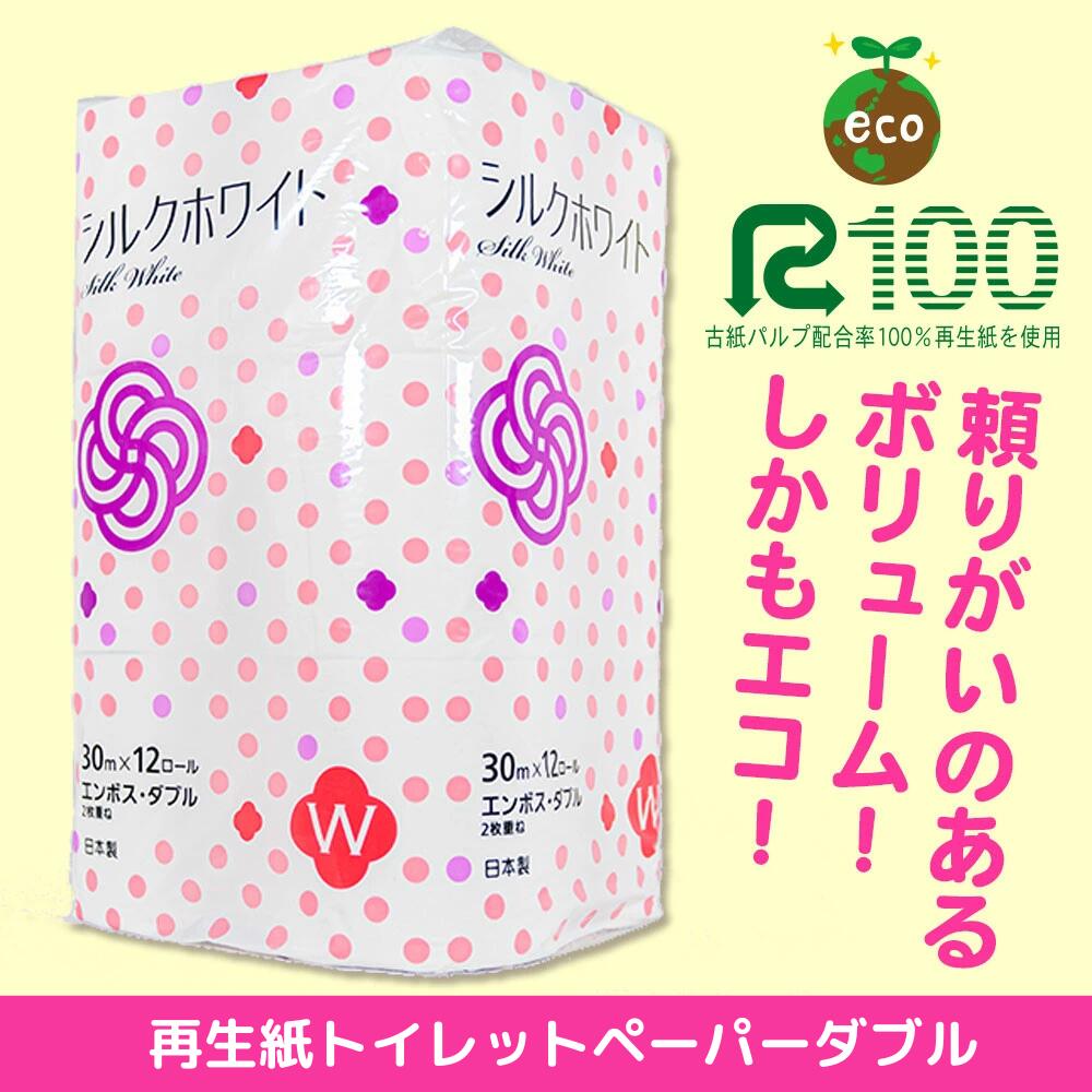 - トイレットペーパー (30m) ダブル 96個 無香料 シルクホワイト 送料無料 大容量 日用品 まとめ買い 日用雑貨 紙 消耗品 生活必需品 物価高騰対策 防災 備蓄 生活雑貨 SDGsリサイクル エコ 再生紙100% 岩手 一関市