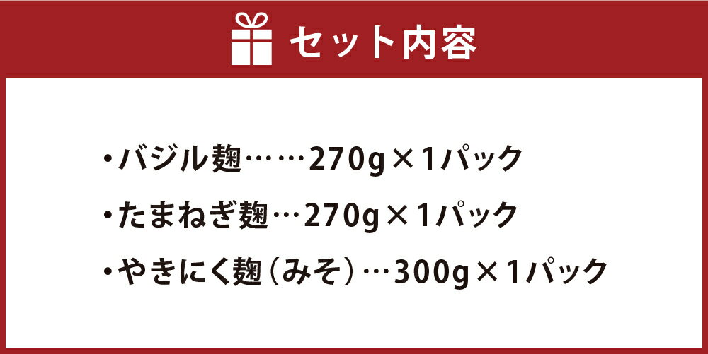 【ふるさと納税】らくらくセット 3点入り バジル麹・たまねぎ麹・やきにく麹(みそ) 各1パック 計840g 米麹 米こうじ 国産米 オリーブオイル 玉ねぎ タマネギ 味噌 焼肉 無添加 発酵調味料 発酵食品 着色料・保存料・化学調味料・甘味料・香料不使用 健康 冷蔵 送料無料