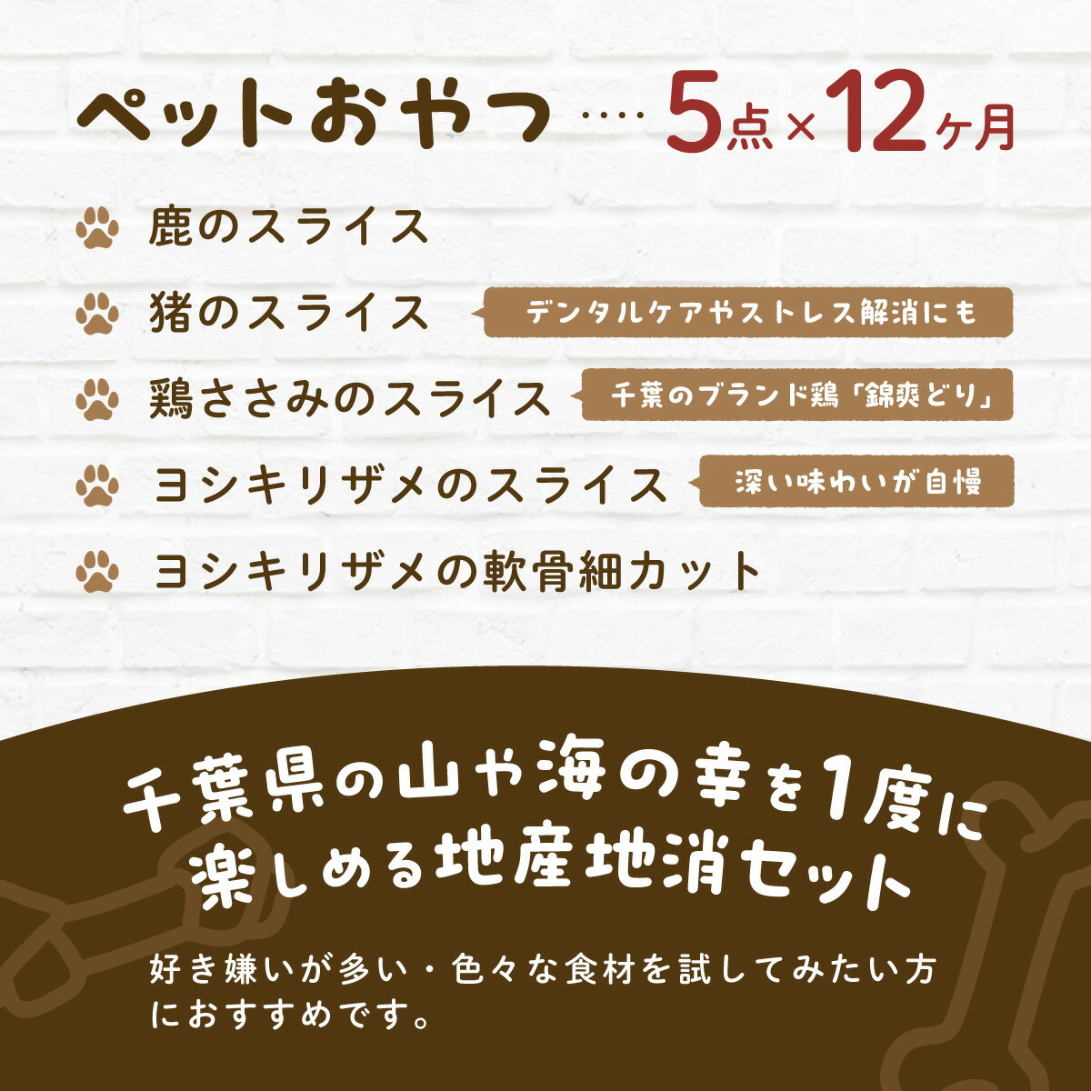 【ふるさと納税】【毎月届く】&WAN Kitchenペットおやつセット(千葉堪能セット)(鹿肉スライス/猪肉スライス/錦爽どりささみ/サメスライス・サメ軟骨) SMU022