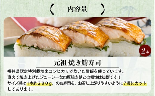 【年内発送可能!(12月26日決済完了分まで)】 焼き鯖寿司の元祖が贈る 「元祖焼き鯖寿司」 2本セット 1本あたり 約280g ~家族が喜ぶ手土産~【名物 ジューシー 焼きさば 押し寿司 さば寿司 すし こしひかり 贈答 ギフト お土産 大人気】 [A-0567]