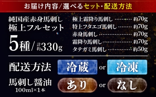 - 【冷凍 馬刺し専用醤油付き】純国産馬 馬刺し極上フルセット計約330g 馬刺し専用醤油付き(極上霜降り/約70g 特上フタエゴ/約70g 霜降り/約70g タテガミ/約50g 赤身/約70g) / ばさし 馬刺 熊本馬刺し 熊本県 菊陽町【株式会社古閑ファーム】 [BHDF016]