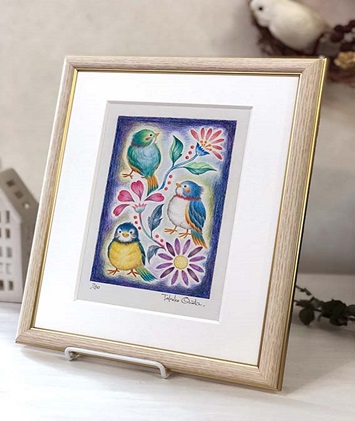 - 白木フレーム入り版画「小鳥たち」絵本作家おまたたかこジークレー版画