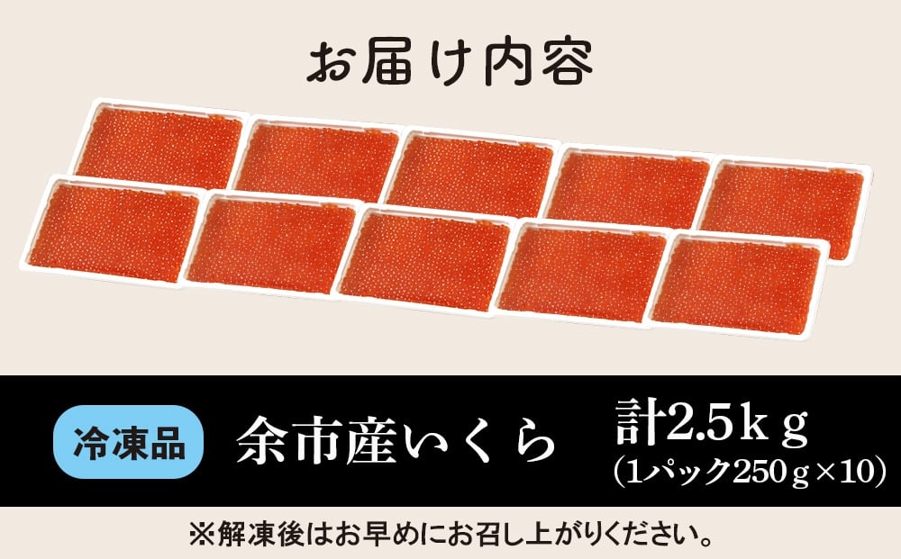 - 余市産 いくら 500g×5箱 2.5kg(250g×10PC) 北海道産 冷凍 鮭いくら 冷凍いくら いくら醤油漬け 化粧箱 贈り物 ギフト 秋鮭 秋鮭の卵 とろける食感 はじける食感 北海道 余市町