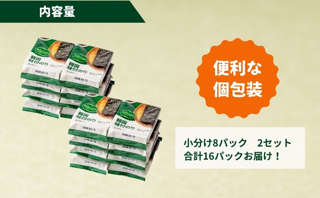 - <選べるセット数>韓国のり bibigo 韓国味付けのり 小分け8パック 2〜5セット | bibigo 8切 8枚 8パック 2セット 5セット 韓国海苔 韓国のり 海苔 のり 味付けのり 常温 食べやすい CJ FOODS JAPAN 埼玉県 草加市