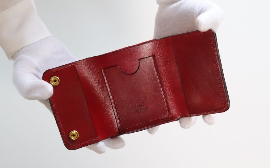 コンパクト財布(バスケット柄カービング・赤系)| 牛ヌメ革 財布 ウォレット 本革 レザー 革 革製品 革小物 コンパクト 経年変化 一点物 一生もの ハンドメイド クラフト 高級 本格 ギフト プレゼント おすすめ