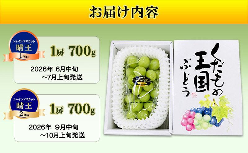 - 【2026年先行予約】晴れの国 大房厳選 シャインマスカット 晴王 夏秋 定期便 2回 コース《2026年6月中旬-10月上旬頃出荷》 ブドウ 果物 マスカット 岡山 里庄 数量限定