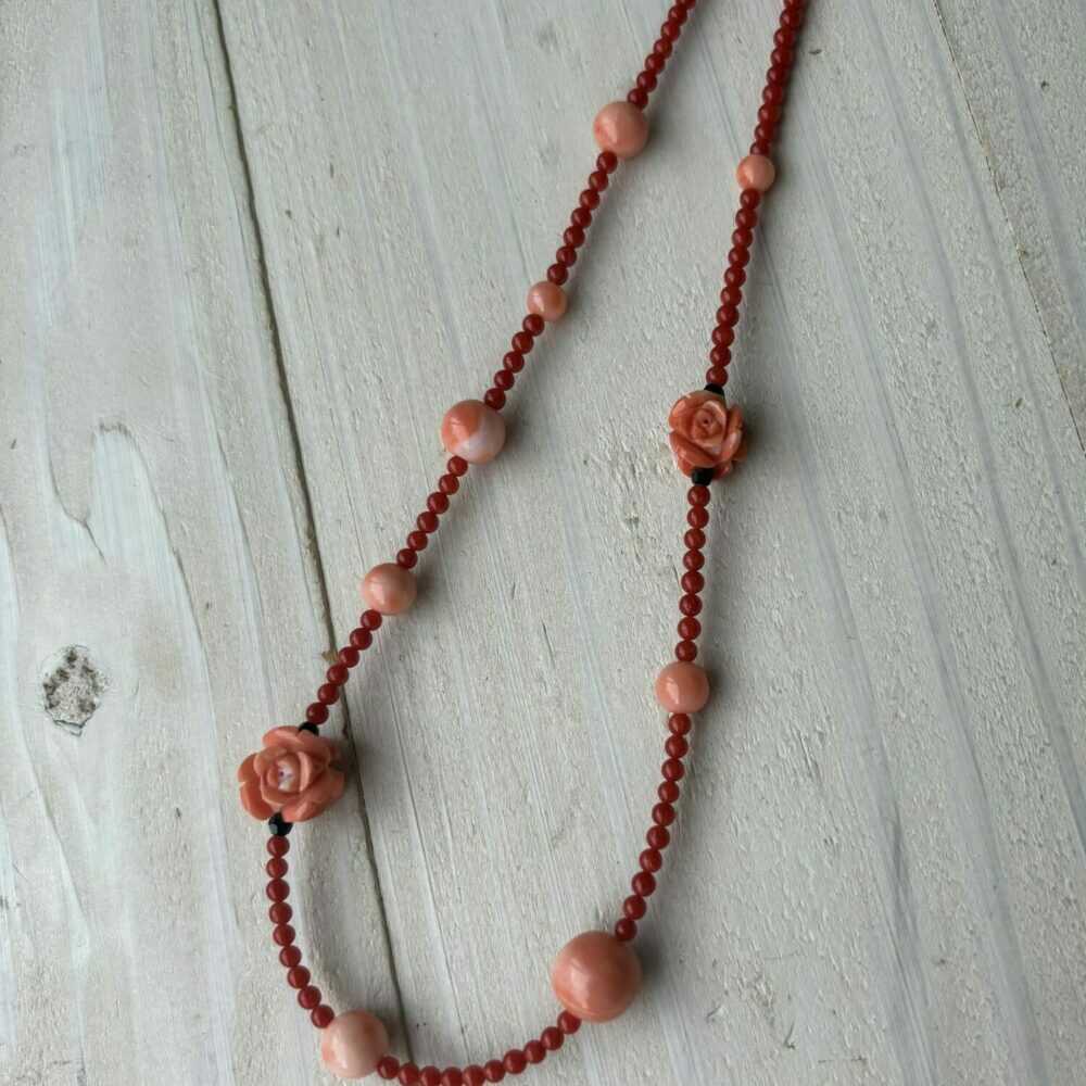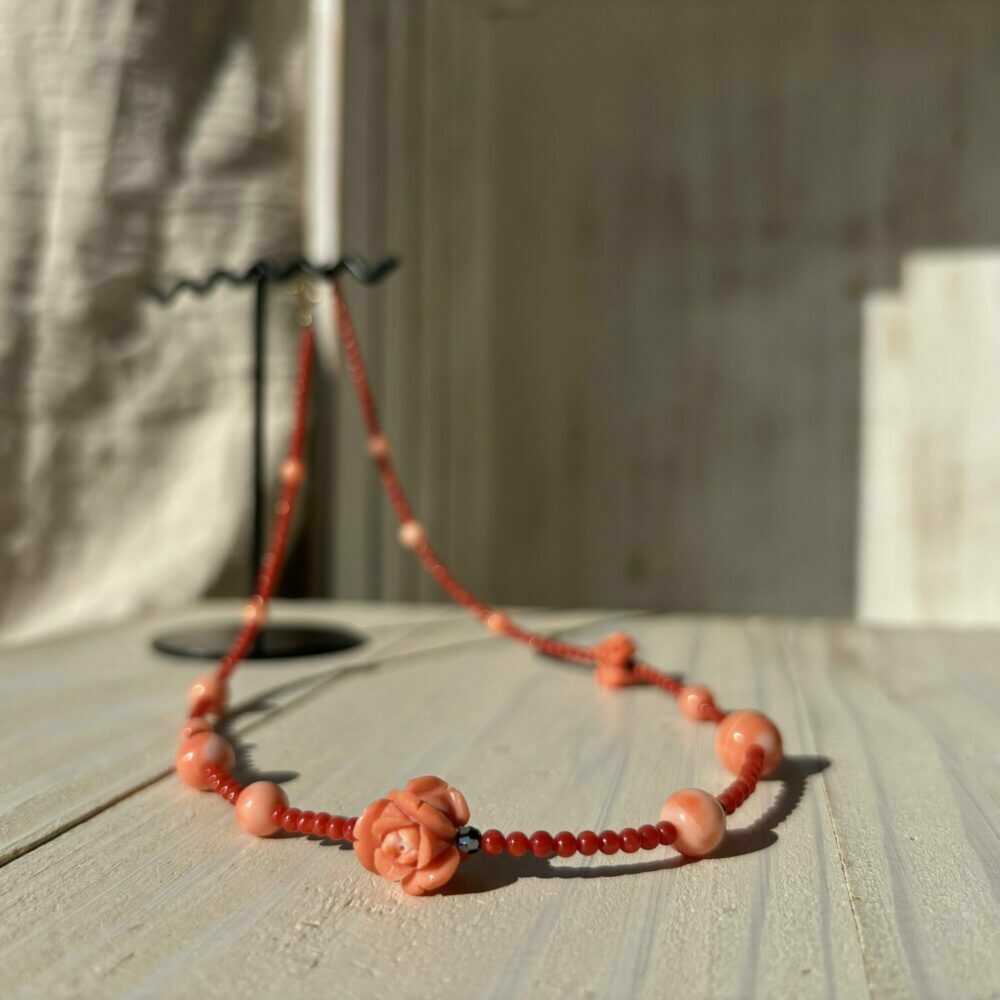 - 【ふるさと納税】【一点もの】K18 宝石珊瑚ネックレス 赤珊瑚ともも色珊瑚の手彫りネックレス 〜ローズガーデン 花園〜 全長約49cm / 18金 レディース 【有限会社米沢サンゴ店】[ATCX064]